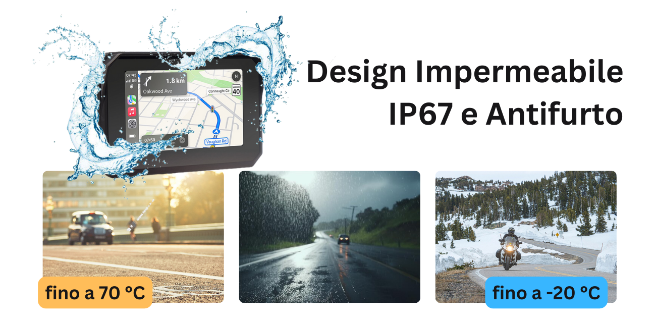 È impermeabile IP67 e antifurto, sia che tu stia guidando in una giornata di sole o affrontando gli elementi, la costruzione robusta e il design impermeabile garantiscono prestazioni affidabili, proteggendo il tuo dispositivo da pioggia, polvere e condizioni difficili, funzionando senza problemi a temperature da -20°C a 70°C.