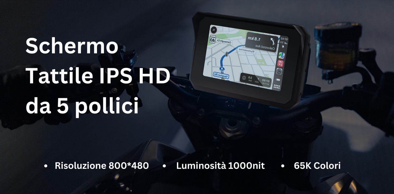 Goditi immagini vivide sullo schermo touch IPS HD da 5 pollici di Ohrex Motorcycle Carplay, con risoluzione di 800*480, 65K colori e luminosità di 1000 nit, perfetto per la visibilità all'aperto e con memoria espandibile con una scheda TF da 64GB.